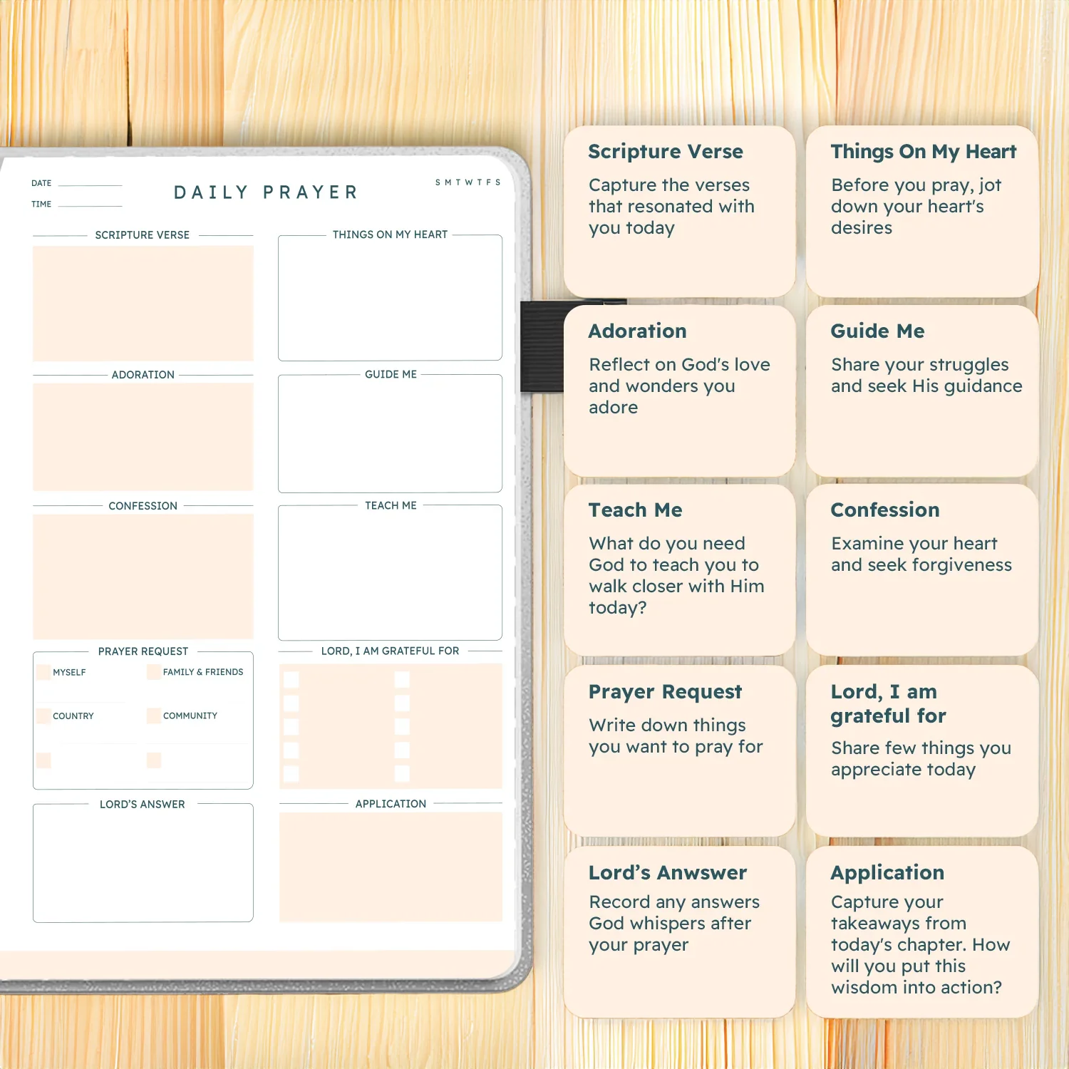 You’ll find prompts like Scripture Verse, Adoration, Confession, Prayer Requests, Lord’s Answer, and more—so you never feel lost in your quiet time again.